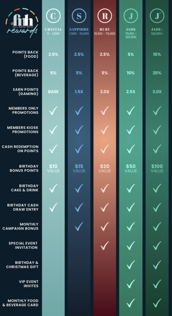Members can check their Full Moon Hotel Rewards point balance at any time via the Restaurant, Bars & Members Kiosk, which is located in the VIP Gaming Lounge.